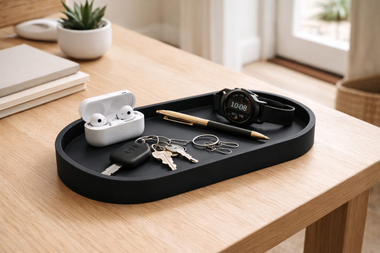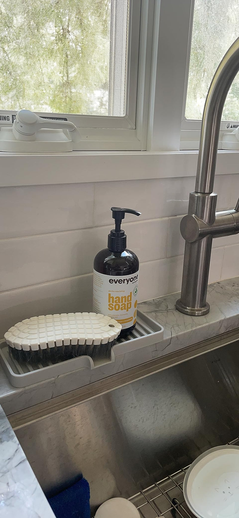 I got tired of having to clean all the drips and soap scum that accumulates under our sink soap dispensers so started to look for a little caddy.This was even better than what I was looking for originally. It’s big enough to fit my hand and dish soap and a sponge perfectly, but not so big it looks silly. I like that the brand name is on the bottom so it is not visible. 10/10 would recommend. It does make our sink area seem less cluttered!