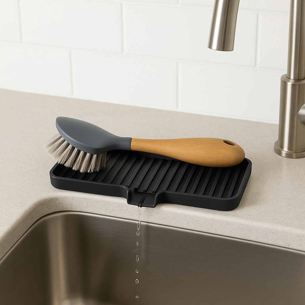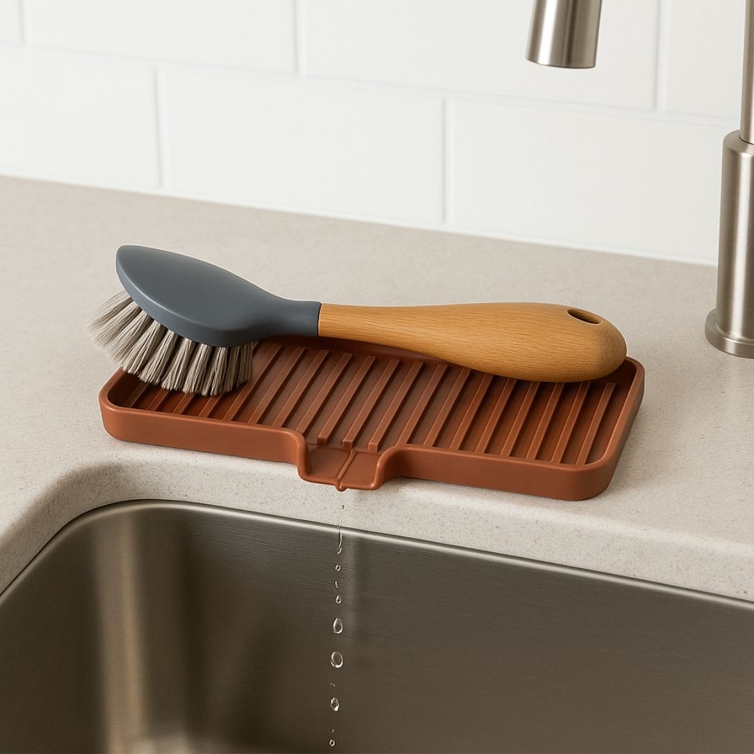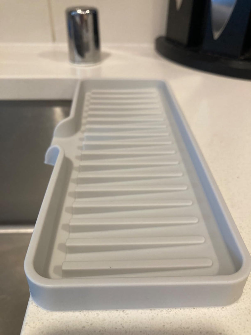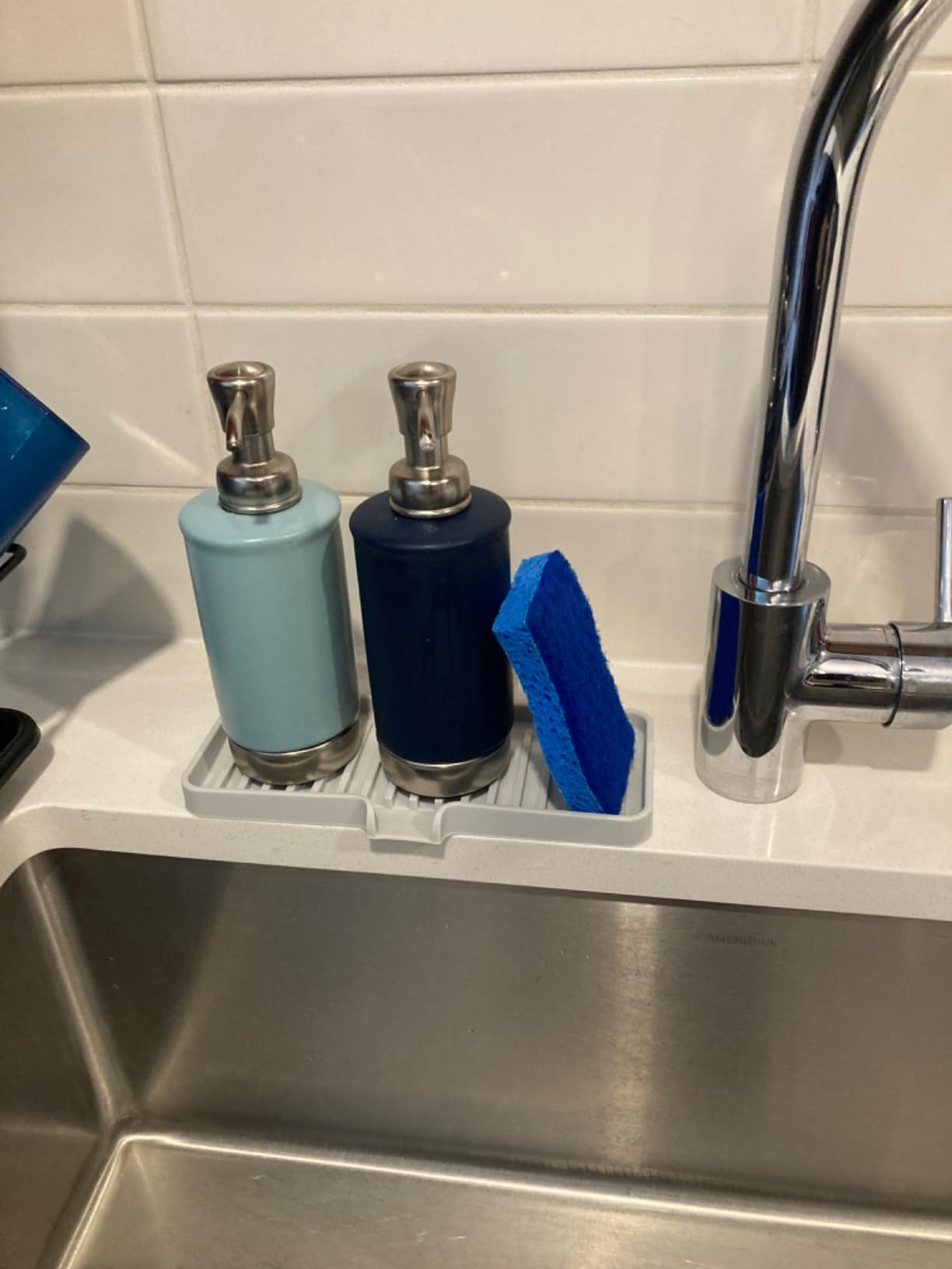 JUST THE RIGHT SIZE. This silicone tray fits perfectly between the regular & filtered water spigots on the lip of my kitchen sink. I position the dish soap & scrubber on it. What's really helpful is it has a nifty little drain that allows the water to drip right into the sink. Stylish, functional, looks good & cleans up in the dishwasher. I’ve had it several months & it is holding up well & doing the job.