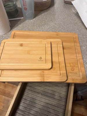 Say goodbye to messy countertops and warped boards with our durable, non-slip bamboo set.