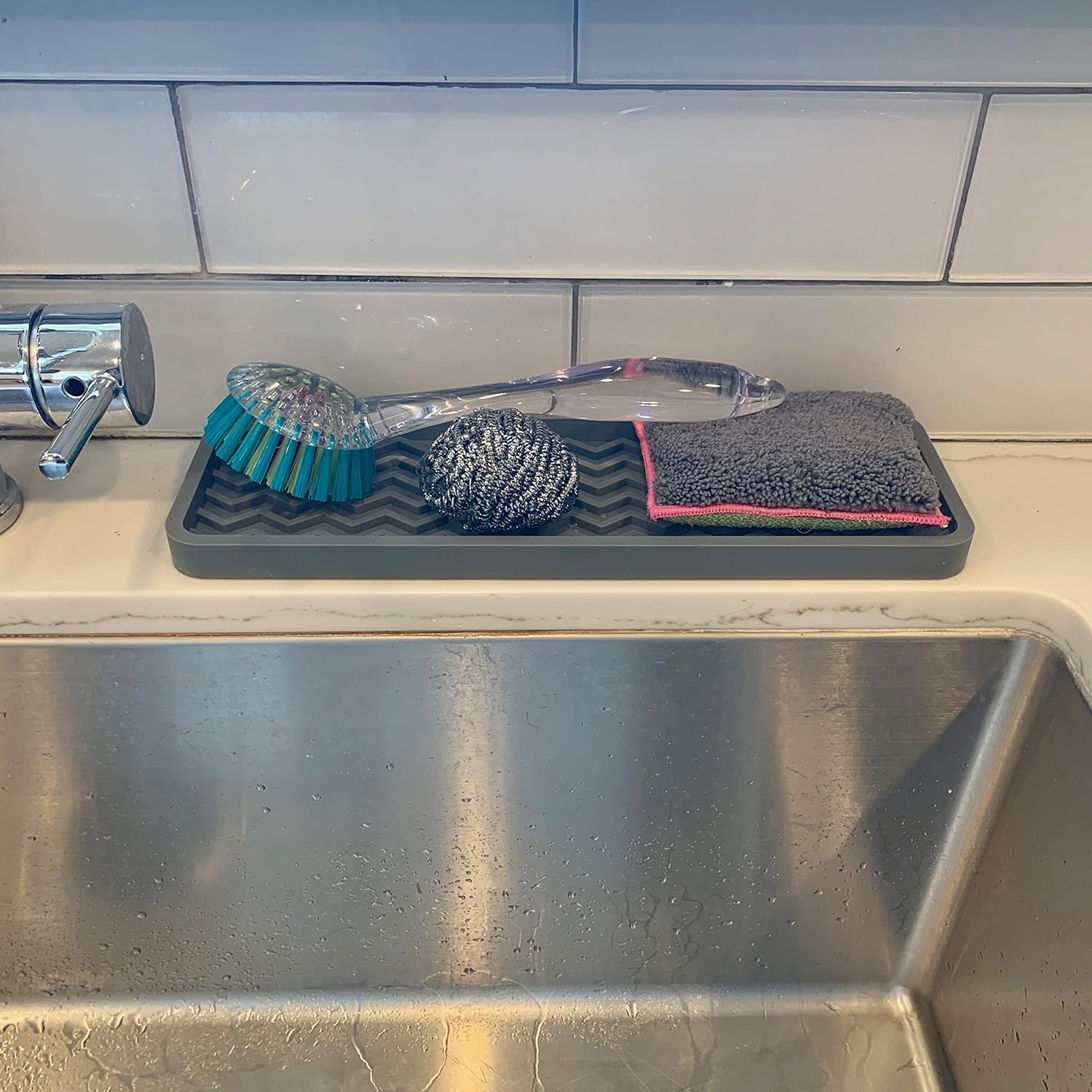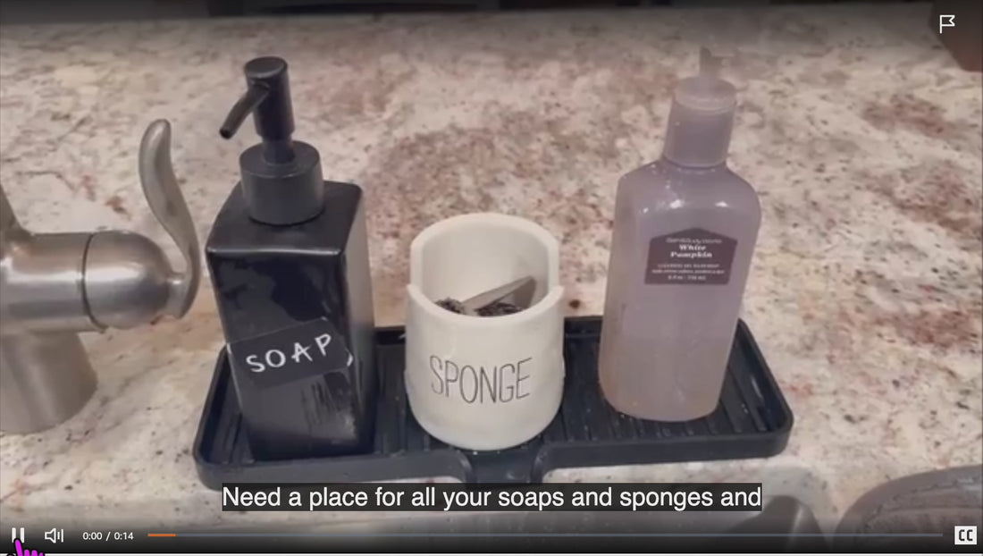 Keeps sponges, brushes and soaps tidy at the sink while draining faster and protecting countertops from water and heat damage