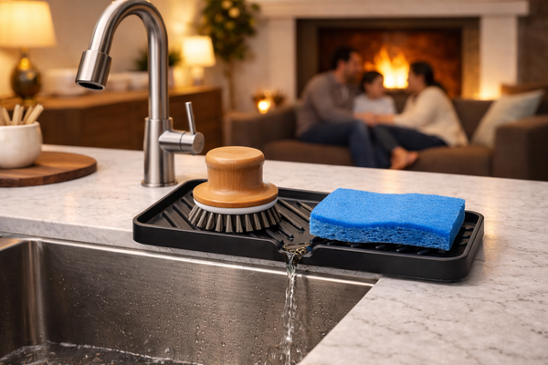 Keep water in the sink—not on your counter. Our tray elevates sponges and bottles so air can circulate and the sloped drain lip sends drips straight into the basin. Heavier, thicker, and built to last, it’s the small upgrade that makes a big difference every day.