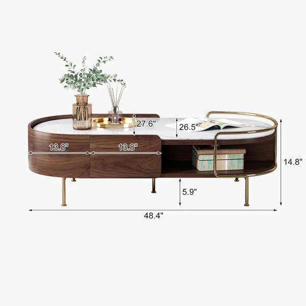 This oval coffee table blends concealed drawers and open shelves to organize essentials, reduce daily clutter, and lift the room’s visual mood for guests.